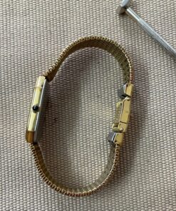 - Dây đeo của đồng hồ được chế tác từ kim loại màu vàng, tạo nên sự đồng nhất và hài hòa với vỏ và mặt đồng hồ. Chất liệu kim loại không chỉ giúp tăng độ bền mà còn mang lại vẻ ngoài bóng bẩy, lịch sự. Vỏ đồng hồ cũng được phủ một lớp màu vàng, làm nổi bật thêm tính thẩm mỹ và sự sang trọng của sản phẩm.