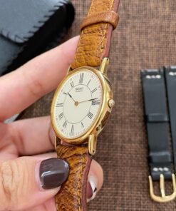 - Dây đồng hồ được làm bằng da màu nâu, mang lại cảm giác ấm áp và thoải mái khi đeo. Đây là một sự kết hợp hoàn hảo với mặt đồ màu trắng và vỏ đồng hồ màu vàng bằng kim loại. Vỏ đồng hồ mạ vàng thể hiện sự sang trọng và đẳng cấp, tạo nên điểm nhấn quý phái cho chiếc đồng hồ này.
